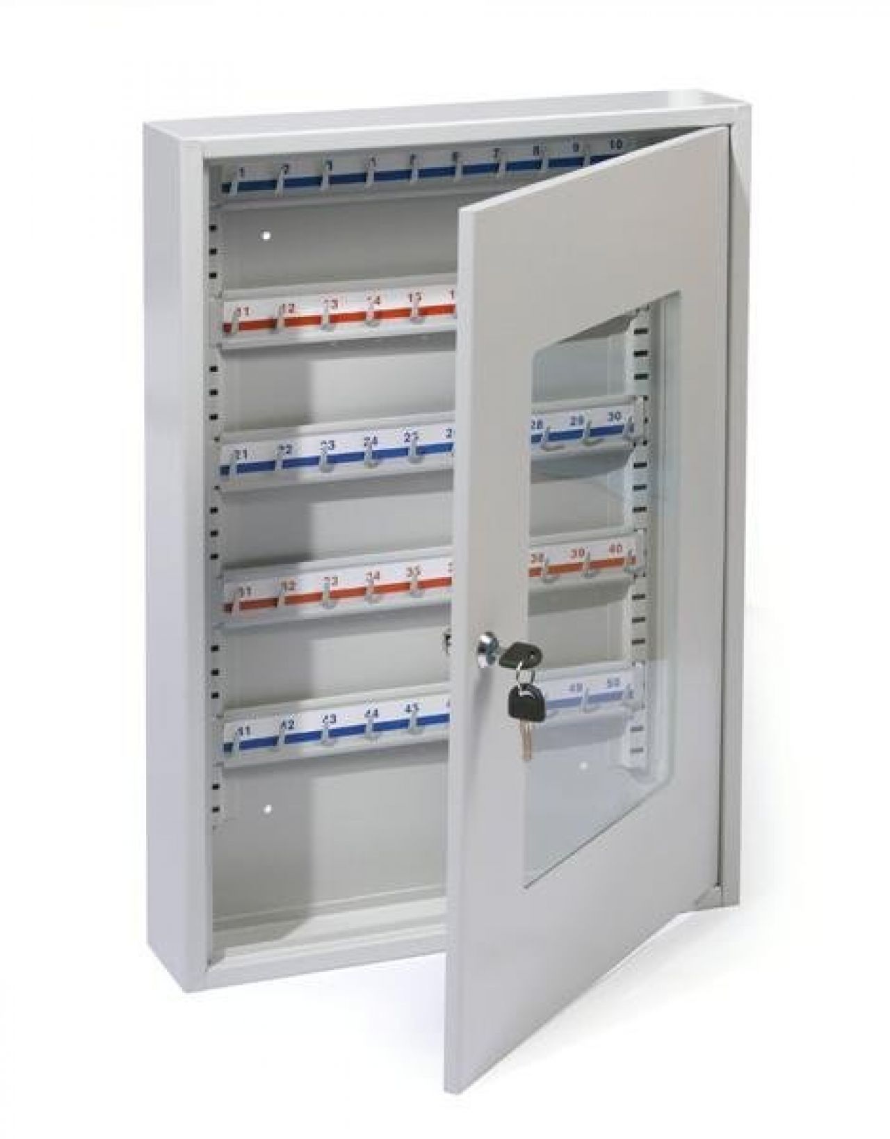 Metalowa szafka na klucze ze szklanymi drzwiczkami kolor jasnopopielaty 50 miejsc na klucze zamek cylindryczny w komplecie 60 zawieszek do kluczy wymiary: 550 x 380x 80 mm